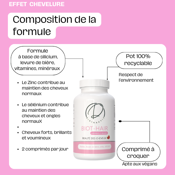 - Maintien de cheveux normaux (zinc, sélénium, biotine)